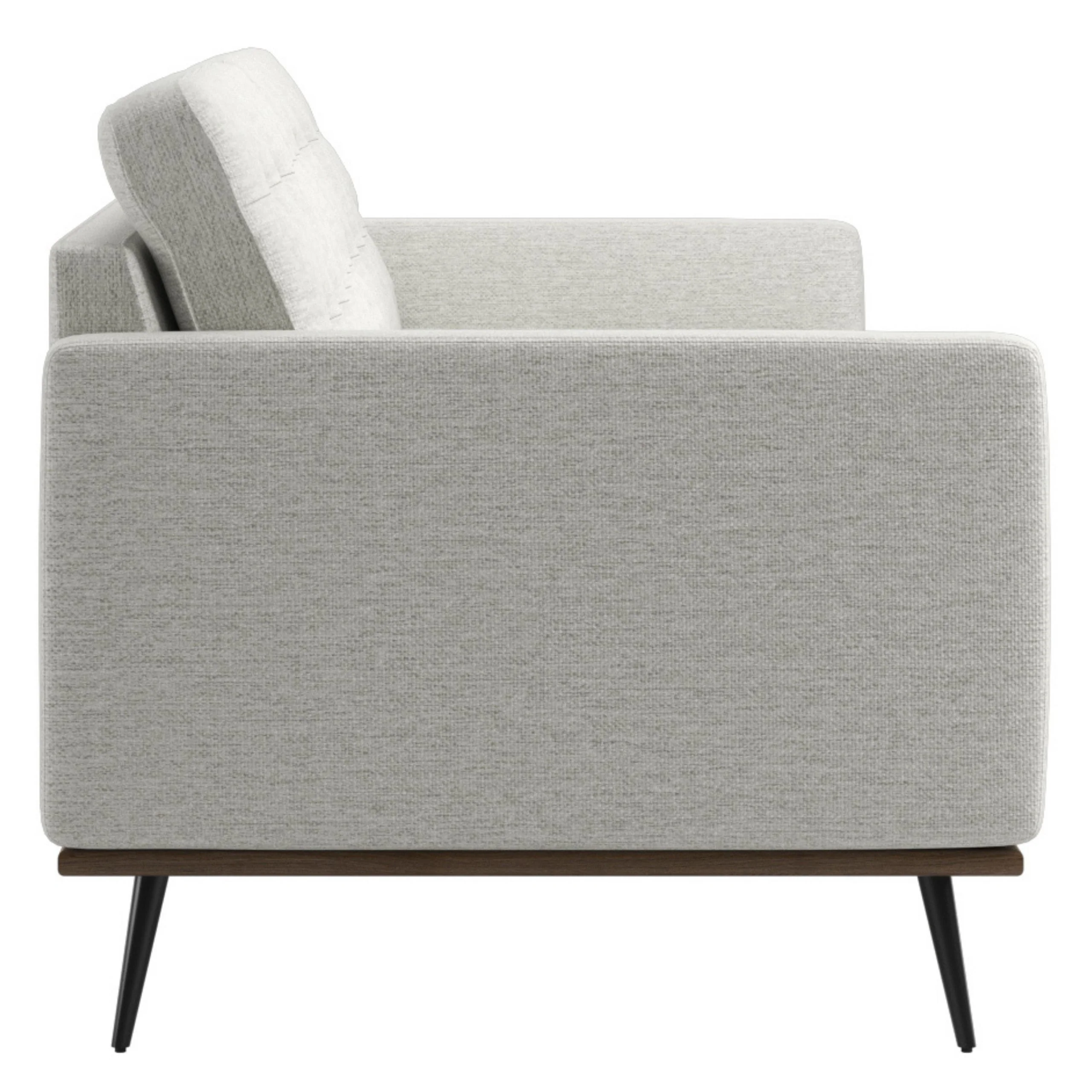 The Loft Deep Seat Sofa in fabric brings comfort-forward design and modern style into perfect balance. Upholstered in soft, high-performance fabric, it offers a cozy, tactile feel that stands up to everyday use, ideal for busy households or relaxed lounging.Ā Its smooth fixed seat is generously padded with 6-inch high-resilience foam and supported by a durable sinuous spring system that keeps its shape over time. The back cushions feature subtle horizontal tufting, adding definition and structure without sacrificing comfort. Filled with plush siliconized Polyfill, the cushions provide an inviting, supportive backrest. Built on a sturdy, termite-resistant frame made from solid wood and plywood, the sofa rests on cone-shaped powder-coated legs and a walnut-finished beechwood base for a grounded, architectural look. Designed to last and age gracefully, this sofa is a refined essential for modern living rooms